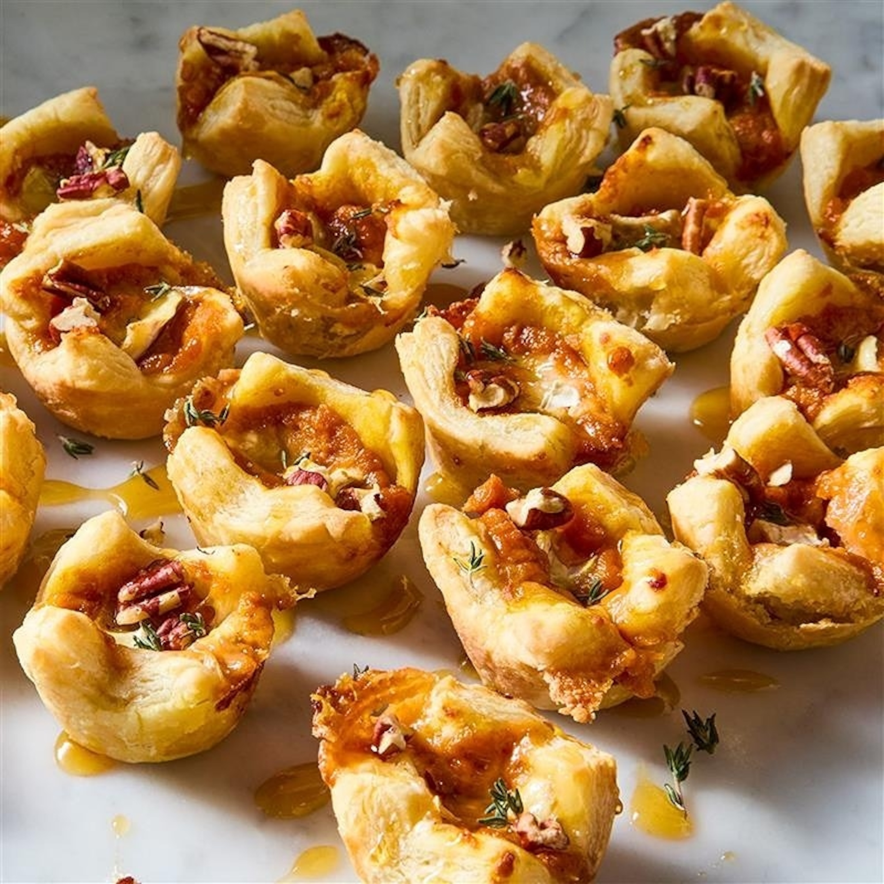 Step 4: Divide pumpkin filling among pastry cups (about 2 teaspoon each). Top each with 1 cube of Brie.